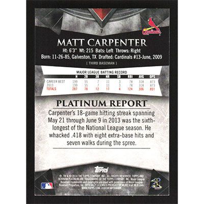 This is a 2014 Bowman Platinum Matt Carpenter baseball card. The card is #7 and pictures show condition.