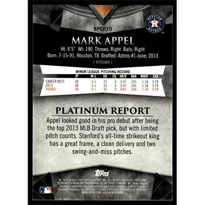 This is a 2014 Bowman Platinum Chrome Prospects X-Fractors Mark Appel baseball card. The card is #BPCP70 and pictures show condition. Team(s): Houston Astros