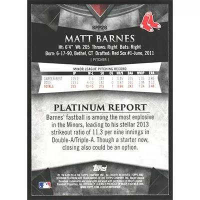 This is a 2014 Bowman Platinum Prospects Matt Barnes baseball card. The card is #BPP28 and pictures show condition.
