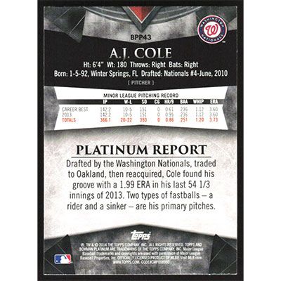 This is a 2014 Bowman Platinum Prospects A.J. Cole baseball card. The card is #BPP43 and pictures show condition.