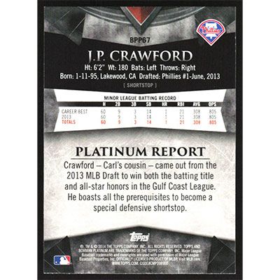 This is a 2014 Bowman Platinum Prospects J.P. Crawford baseball card. The card is #BPP67 and pictures show condition.