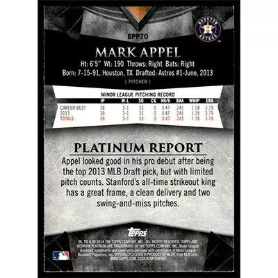 This is a 2014 Bowman Platinum Prospects Mark Appel baseball card. The card is #BPP70 and pictures show condition.