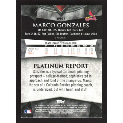 This is a 2014 Bowman Platinum Prospects Marco Gonzales baseball card. The card is #BPP77 and pictures show condition.