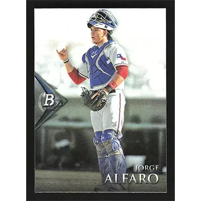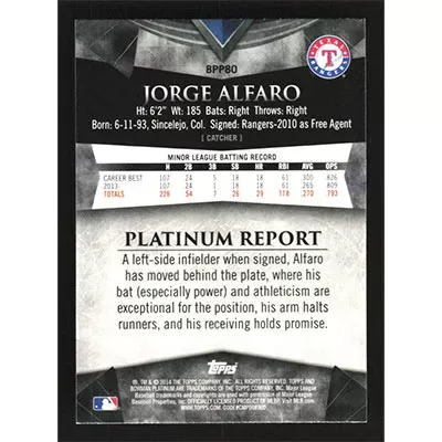 This is a 2014 Bowman Platinum Prospects Jorge Alfaro baseball card. The card is #BPP80 and pictures show condition.