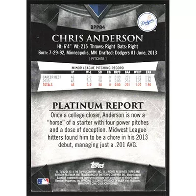 This is a 2014 Bowman Platinum Prospects Chris Anderson baseball card. The card is #BPP84 and pictures show condition.