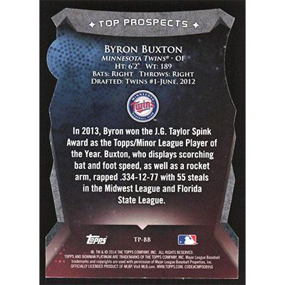 This is a 2014 Bowman Platinum Top Prospects Die Cuts Byron Buxton baseball card. The card is #TP-BB and pictures show condition. Team(s): Minnesota Twins