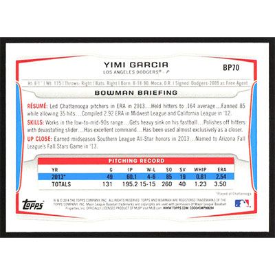 This is a 2014 Bowman Prospects Hometown Yimi Garcia baseball card. The card is #BP70 and pictures show condition.