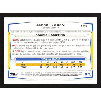 This is a 2014 Bowman Prospects Hometown Jacob deGrom baseball card. The card is #BP73 and pictures show condition.
