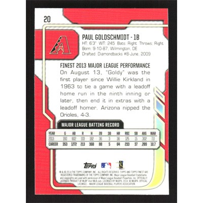 This is a 2014 Finest Paul Goldschmidt baseball card. The card is #20 and pictures show condition.