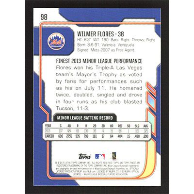 This is a 2014 Finest Wilmer Flores baseball card. The card is #98 and pictures show condition.