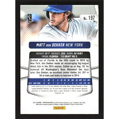 This is a 2014 Panini Prizm Matt den Dekker baseball card. The card is #197 and pictures show condition.