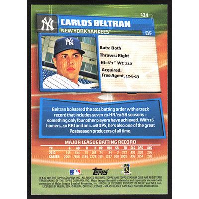 This is a 2014 Stadium Club Carlos Beltran baseball card. The card is #134 and pictures show condition.