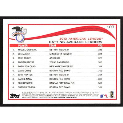 This is a 2014 Topps Miguel Cabrera, Joe Mauer and Mike Trout League Leaders baseball card. The card is #103 and pictures show condition. Team(s): Detroit Tigers/Minnesota Twins/Los Angeles Angels