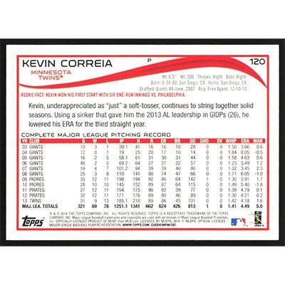 This is a 2014 Topps Kevin Correia baseball card. The card is #120 and pictures show condition.