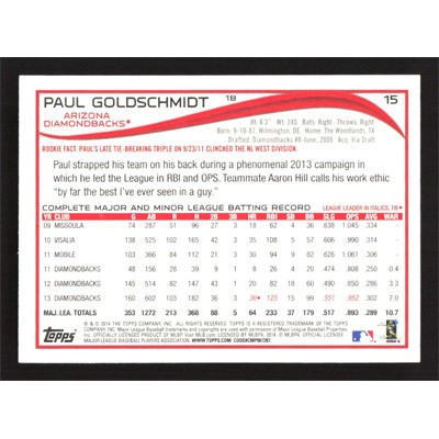 This is a 2014 Topps Paul Goldschmidt baseball card. The card is #15 and pictures show condition.