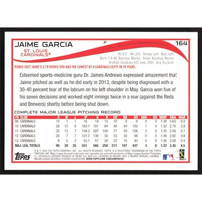 This is a 2014 Topps Jaime Garcia baseball card. The card is #164 and pictures show condition.