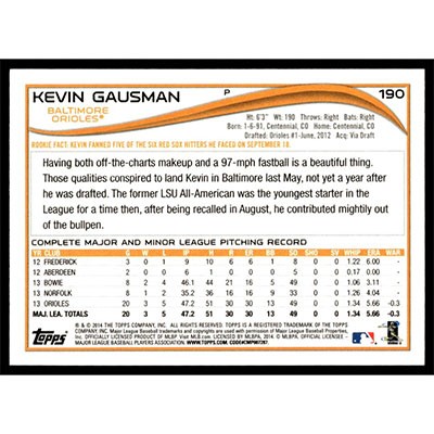 This is a 2014 Topps Kevin Gausman Future Stars baseball card. The card is #190 and pictures show condition.