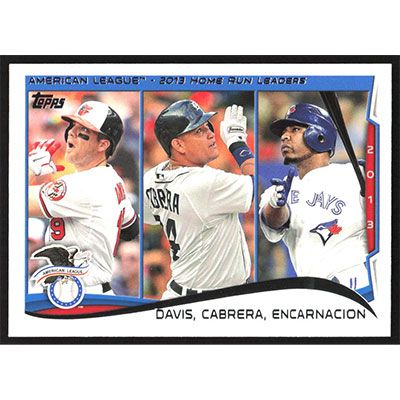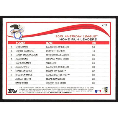 This is a 2014 Topps Chris Davis, Miguel Cabrera and Edwin Encarnacion League Leaders baseball card. The card is #29 and pictures show condition. Team(s): Baltimore Orioles/Detroit Tigers/Toronto Blue Jays