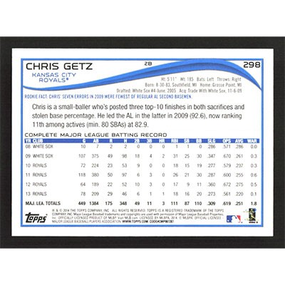 This is a 2014 Topps Chris Getz baseball card. The card is #298 and pictures show condition.