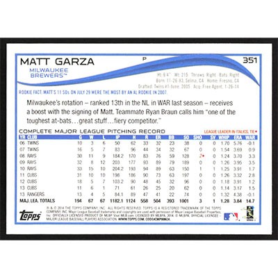 This is a 2014 Topps Matt Garza baseball card. The card is #351 and pictures show condition.