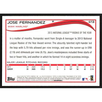 This is a 2014 Topps Jose Fernandez Award Winner baseball card. The card is #413 and pictures show condition.