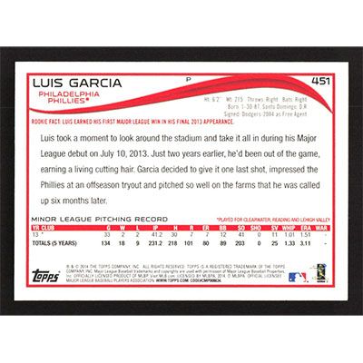 This is a 2014 Topps Luis Garcia baseball card. The card is #451 and pictures show condition.