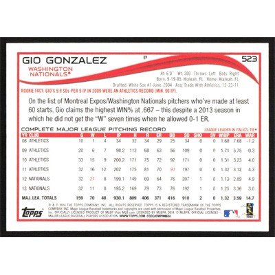 This is a 2014 Topps Gio Gonzalez baseball card. The card is #523 and pictures show condition.