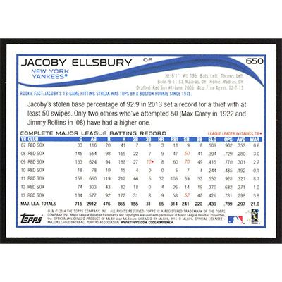 This is a 2014 Topps Jacoby Ellsbury baseball card. The card is #650 and pictures show condition.