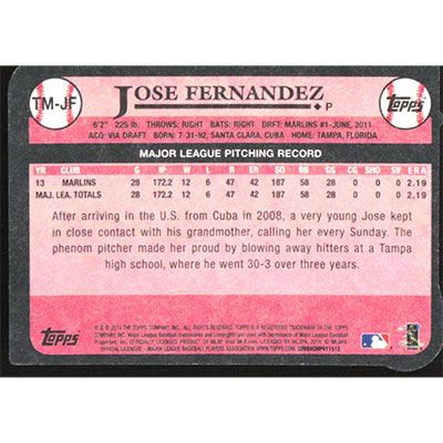 This is a 2014 Topps '89 Die Cut Minis Jose Fernandez baseball card. The card is #TM-JF and pictures show condition.