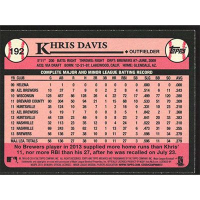 This is a 2014 Topps Archives Khris Davis baseball card. The card is #192 and pictures show condition.