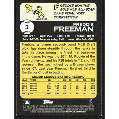 This is a 2014 Topps Archives Freddie Freeman baseball card. The card is #3 and pictures show condition.