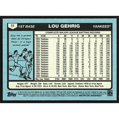 This is a 2014 Topps Archives Lou Gehrig baseball card. The card is #51 and pictures show condition.