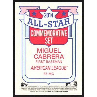 This is a 2014 Topps Archives '87 All-Stars Miguel Cabrera baseball card. The card is #87-MC and pictures show condition.