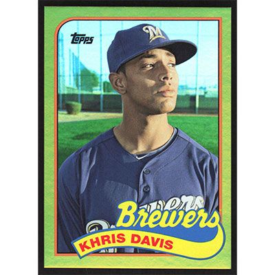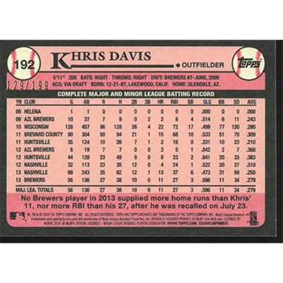 This is a 2014 Topps Archives Gold Khris Davis baseball card. The card is #192 and pictures show condition. This card is limited; #'d 129/199. Team(s): Milwaukee Brewers