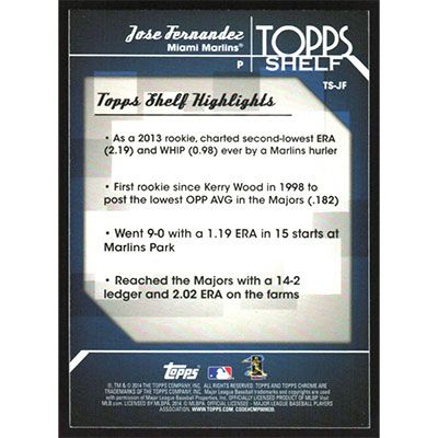 This is a 2014 Topps Chrome Topps Shelf Refractors Jose Fernandez baseball card. The card is #TS-JF and pictures show condition.