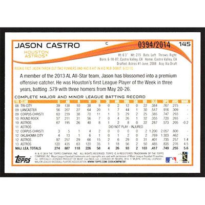 This is a 2014 Topps Gold Jason Castro baseball card. The card is #145 and pictures show condition. This card is limited; #'d 0394/2014. Team(s): Houston Astros