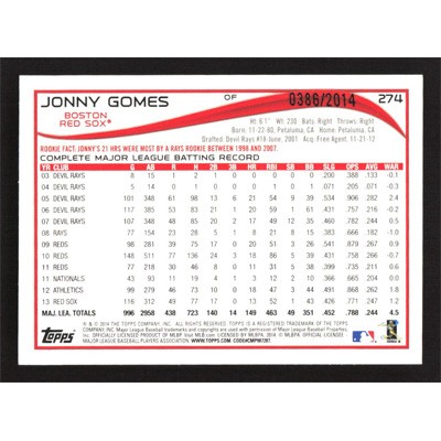 This is a 2014 Topps Gold Jonny Gomes baseball card. The card is #274 and pictures show condition. This card is limited; #'d 0386/2014. Team(s): Boston Red Sox