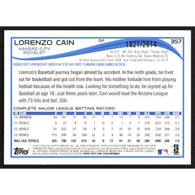 This is a 2014 Topps Gold Lorenzo Cain baseball card. The card is #357 and pictures show condition. This card is limited; #'d 1821/2014. Team(s): Kansas City Royals