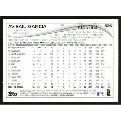 This is a 2014 Topps Gold Avisail Garcia baseball card. The card is #526 and pictures show condition. This card is limited; #'d 0141/2014. Team(s): Chicago White Sox