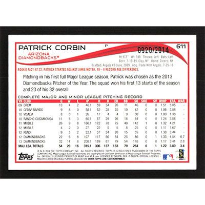 This is a 2014 Topps Gold Patrick Corbin baseball card. The card is #611 and pictures show condition. This card is limited; #'d 0920/2014. Team(s): Arizona Diamondbacks