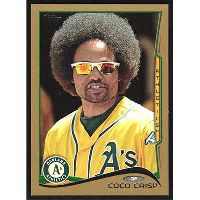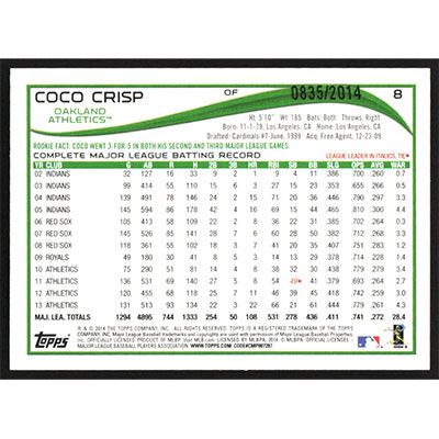 This is a 2014 Topps Gold Coco Crisp baseball card. The card is #8 and pictures show condition. This card is limited; #'d 0835/2014. Team(s): Oakland Athletics