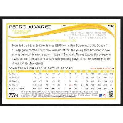 This is a 2014 Topps Green Pedro Alvarez baseball card. The card is #192 and pictures show condition.