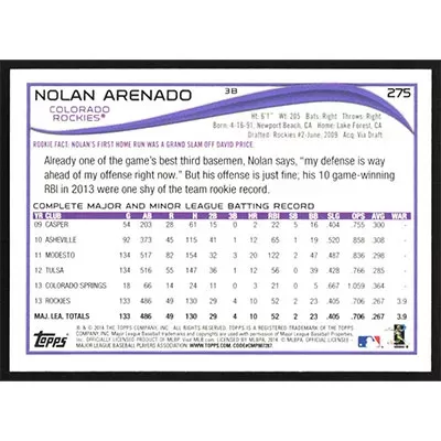 This is a 2014 Topps Green Nolan Arenado baseball card. The card is #275 and pictures show condition.