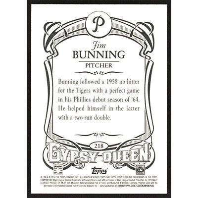 This is a 2014 Topps Gypsy Queen Jim Bunning baseball card. The card is #218 and pictures show condition.