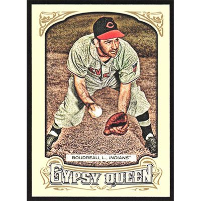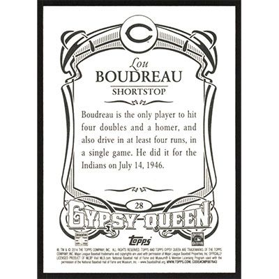 This is a 2014 Topps Gypsy Queen Lou Boudreau baseball card. The card is #28 and pictures show condition.