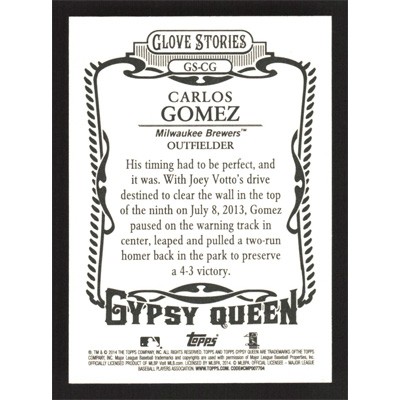 This is a 2014 Topps Gypsy Queen Glove Stories Carlos Gomez baseball card. The card is #GS-CG and pictures show condition.