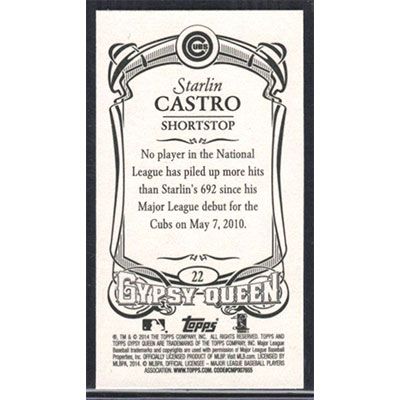 This is a 2014 Topps Gypsy Queen Mini Starlin Castro baseball card. The card is #22 and pictures show condition.