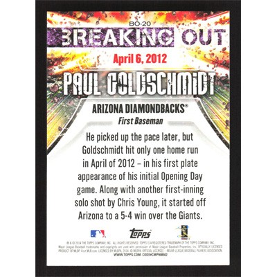 This is a 2014 Topps Opening Day Breaking Out Paul Goldschmidt baseball card. The card is #BO-20 and pictures show condition. Team(s): Arizona Diamondbacks
