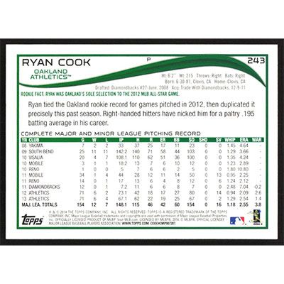 This is a 2014 Topps Red Foil Ryan Cook baseball card. The card is #243 and pictures show condition.