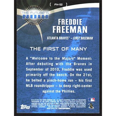 This is a 2014 Topps The Future is Now Freddie Freeman baseball card. The card is #FN-52 and pictures show condition.